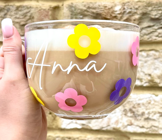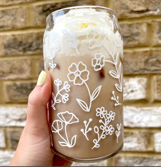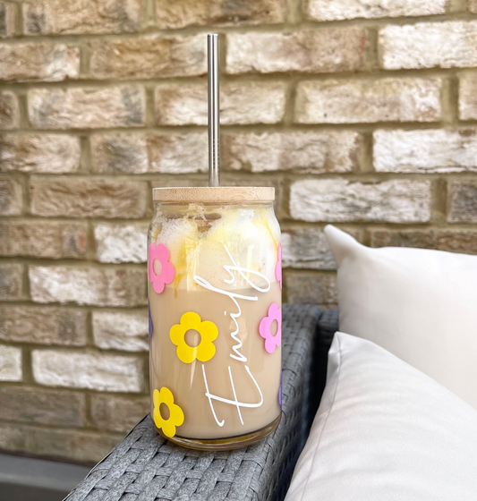 Personalised Retro Floral Can Glass with Bamboo lid and Straw